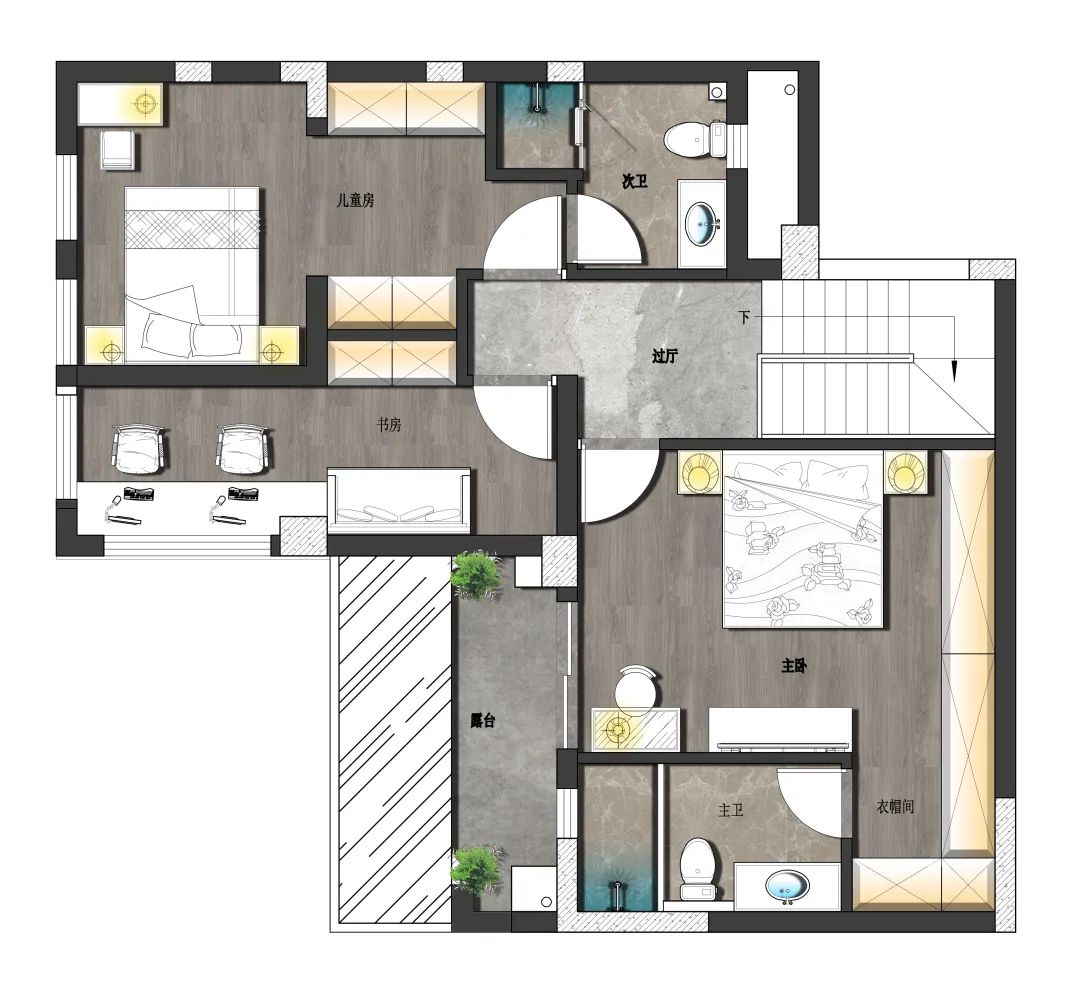 為滿足屋主三世同堂的需求,設(shè)計(jì)師選擇現(xiàn)澆二樓作為主臥的使用,整面墻的衣柜滿足儲(chǔ)存需求,并按照屋主家里老人居住的需求,將1樓單獨(dú)做出老人房的空間,現(xiàn)代風(fēng)格致力打造三世同堂的理想家居。