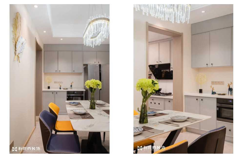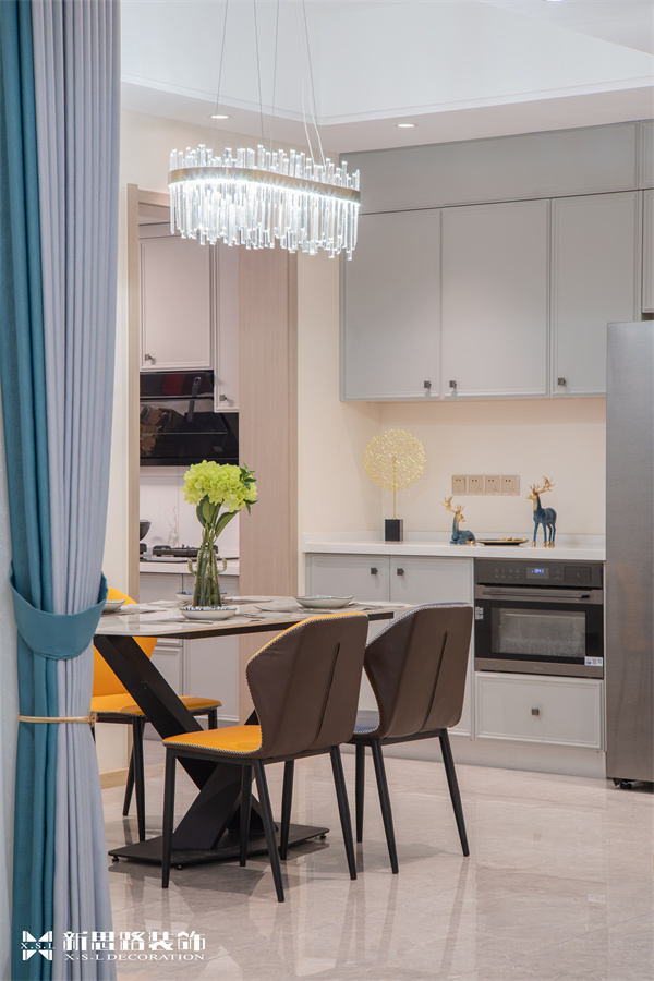 餐廳延續(xù)了整體空間的主色調(diào)和線條美感,大理石餐桌蓄意帶來(lái)一種自然的藝術(shù)氛圍,在原有的沉穩(wěn)柔和中注入新的活力,素色的皮革餐椅打造出舒適的觸感。讓人全情地投入生活,熱愛(ài)生活中一食一飲的歡愉??蛷d與餐廳開(kāi)放式相連,整體色調(diào)素雅大氣,將抽象的自然意象,化為簡(jiǎn)約的視覺(jué)符號(hào);背景墻面的藝術(shù)裝置,擁有琥珀色的溫暖氣息,帶來(lái)多維度的層次感;樸素、自然、溫暖,設(shè)計(jì)師以現(xiàn)代藝術(shù)演變空間圖案,讓人不經(jīng)意間,總能感受到時(shí)間的沉淀。
