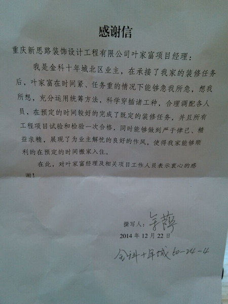 12月22日下午,新思路裝飾江北店收到了金科十年城業(yè)主余老師親自送來一封感謝信。信里洋溢著她對公司及葉家富工長的贊美和感謝之情,也讓我們感受到了來自冬日里的一抹溫暖和感動。