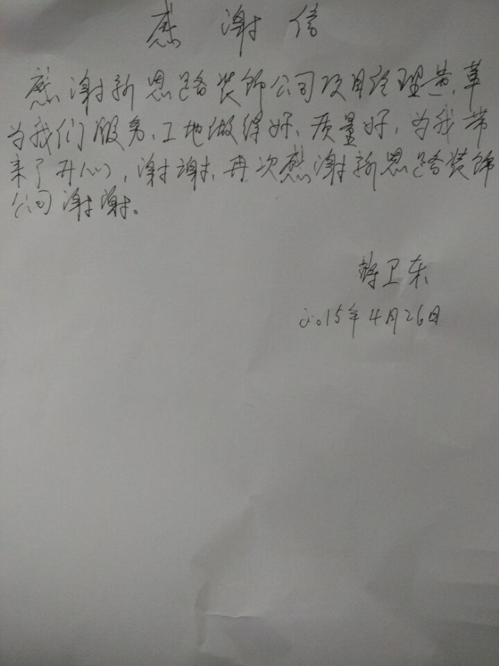 在信中,蔣老師表達(dá)了對(duì)新思路裝飾和黃工長(zhǎng)的感謝之情:“感謝新思路裝飾公司,也感謝黃工長(zhǎng),工地做得好,服務(wù)好,為我?guī)?lái)了開(kāi)心,再次謝謝”!