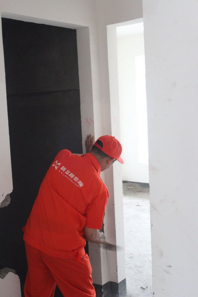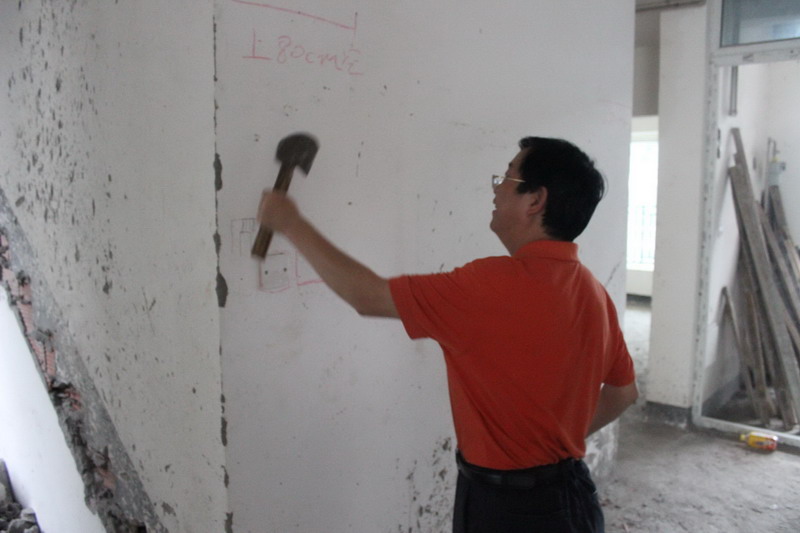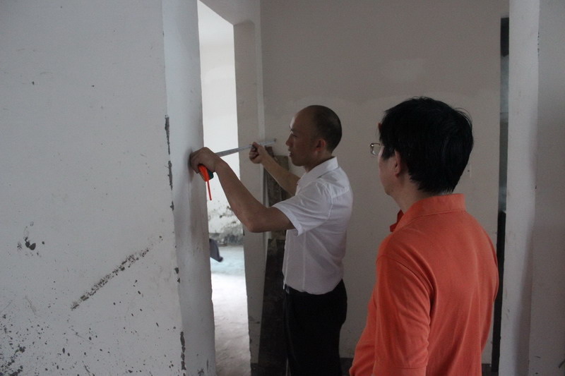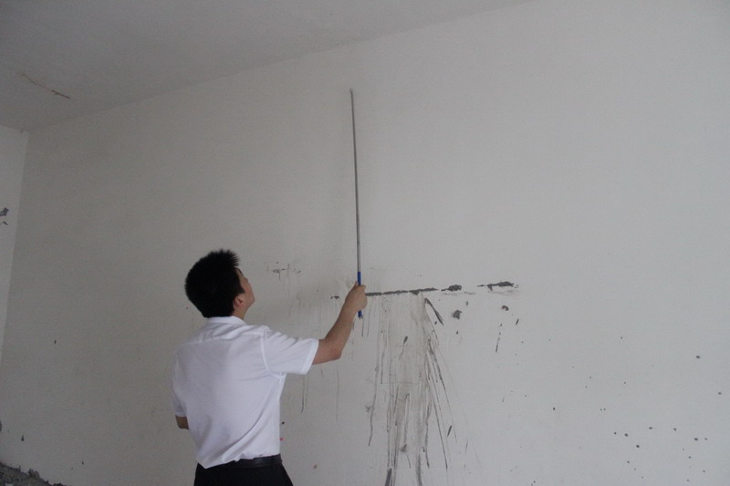 工程質(zhì)檢正在仔細(xì)檢查墻體有無(wú)空鼓情況。