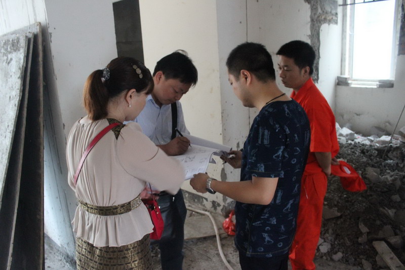 設(shè)計(jì)師、業(yè)主、工長(zhǎng)三方商討樓梯間的改造方案。