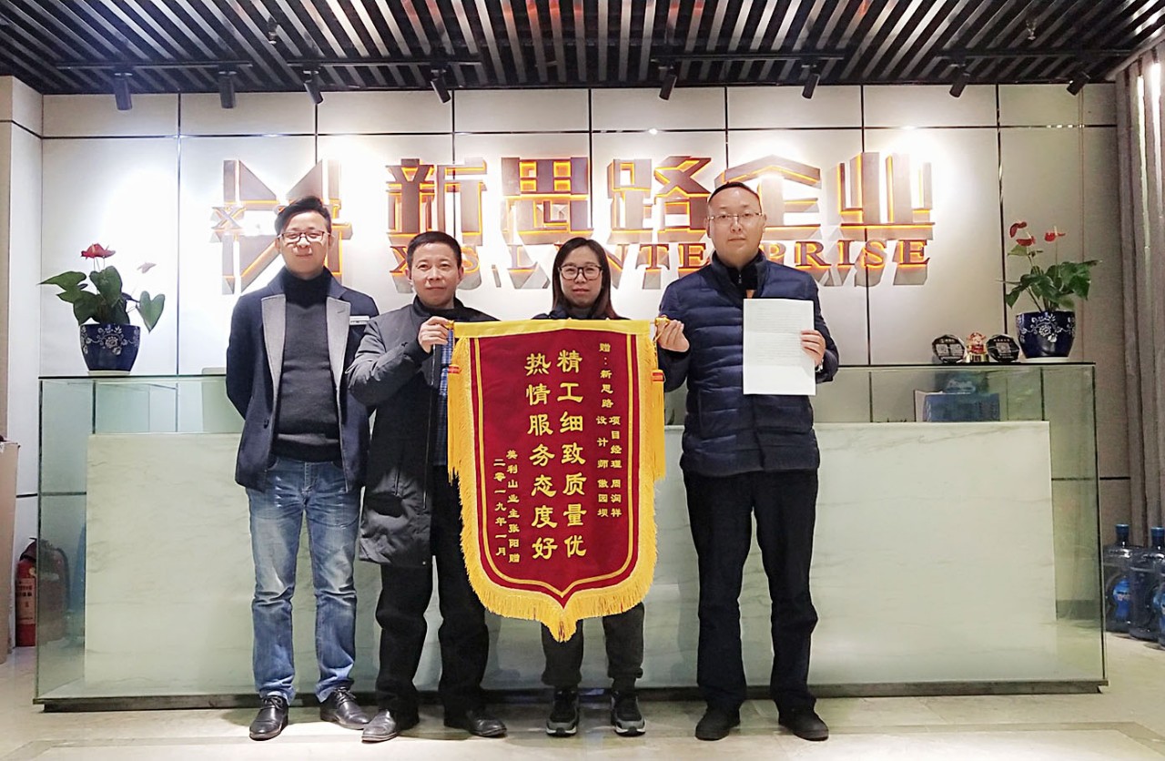 2019年1月23日下午,來自美利山業(yè)主張老師專程來到南坪總部,將一面印有“精工細(xì)致質(zhì)量優(yōu),熱情服務(wù)態(tài)度好”的錦旗交給我們的設(shè)計(jì)師敖組長和項(xiàng)目經(jīng)理周經(jīng)理手中,以感謝新思路裝飾高品質(zhì)工藝和優(yōu)質(zhì)貼心的家裝服務(wù)。