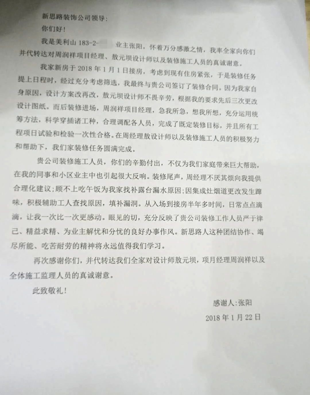 張老師說到:“我家新房于2018年1月1日接房,考慮到現(xiàn)有住房緊張,于是裝修任務(wù)提上日程時(shí),經(jīng)過充分考慮篩選,我最終與貴公司簽訂了裝修合同。因?yàn)槲壹易陨碓颍O(shè)計(jì)方案改再改,敖設(shè)計(jì)師不畏辛勞,根據(jù)我的要求先后三次更改設(shè)計(jì)圖紙。而后裝修進(jìn)場(chǎng),項(xiàng)目經(jīng)理周經(jīng)理,急我所急,想我所想,充分運(yùn)用統(tǒng)籌方法,科學(xué)穿插諸工種,合理調(diào)配各人員,完成了既定裝修目標(biāo),并且所有工程項(xiàng)目試驗(yàn)和檢驗(yàn)一次性合格。在周經(jīng)理敖設(shè)計(jì)師以及裝修施工人員的積極努力和幫助下,我們家裝修任務(wù)圓滿完成。貴公司裝修人員,你們的辛勤付出,不僅為我們家庭帶來巨大幫助,在我的同事和小區(qū)業(yè)主中也引起很大反應(yīng)。從入場(chǎng)到接房半年多時(shí)間,日常的點(diǎn)點(diǎn)滴滴,讓我一次比一次更感動(dòng)。眼見的一切,充分反映了貴公司裝修工作人員嚴(yán)于律己、精益求精、為業(yè)主解憂和分憂的良好辦事作風(fēng)。真的,再次感謝你們,并代轉(zhuǎn)達(dá)我們?nèi)覍?duì)敖設(shè)計(jì)師和項(xiàng)目經(jīng)理周經(jīng)理以及全體施工監(jiān)理人員的真誠謝意!“