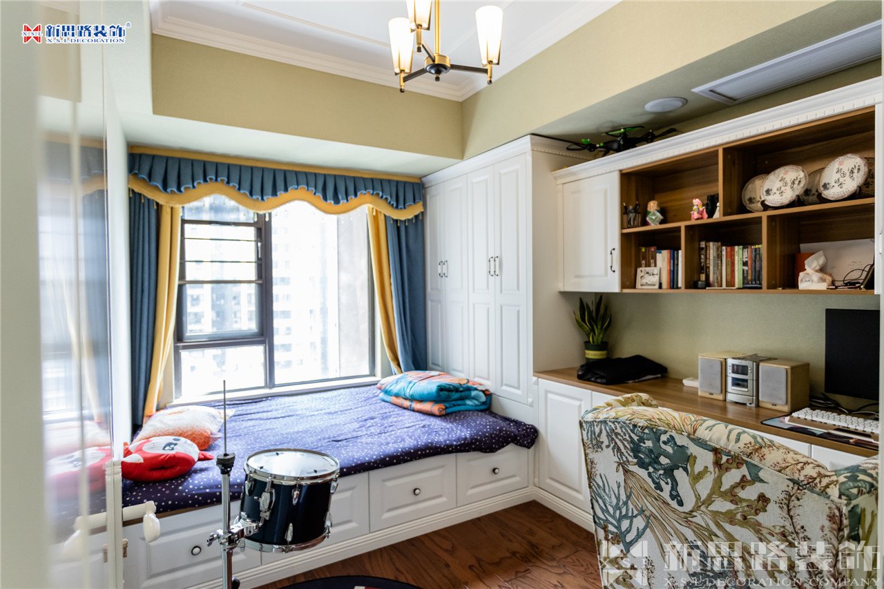 詢問客戶意見后,他們都認(rèn)為沒必要對(duì)戶型有大的改動(dòng),我們便也沒有將戶型做出大改,只是把原本獨(dú)立的衣帽間并入主臥好方便換衣服,愛美的女主人對(duì)此很滿意。不過對(duì)于其中一個(gè)次臥設(shè)計(jì)時(shí),因?yàn)榧抑谐W∪丝谥挥兴麄內(nèi)齻€(gè),不用專門的客房,所以他們的兒子要求將屋子做成音樂練習(xí)室,滿足練習(xí)架子鼓的需求。