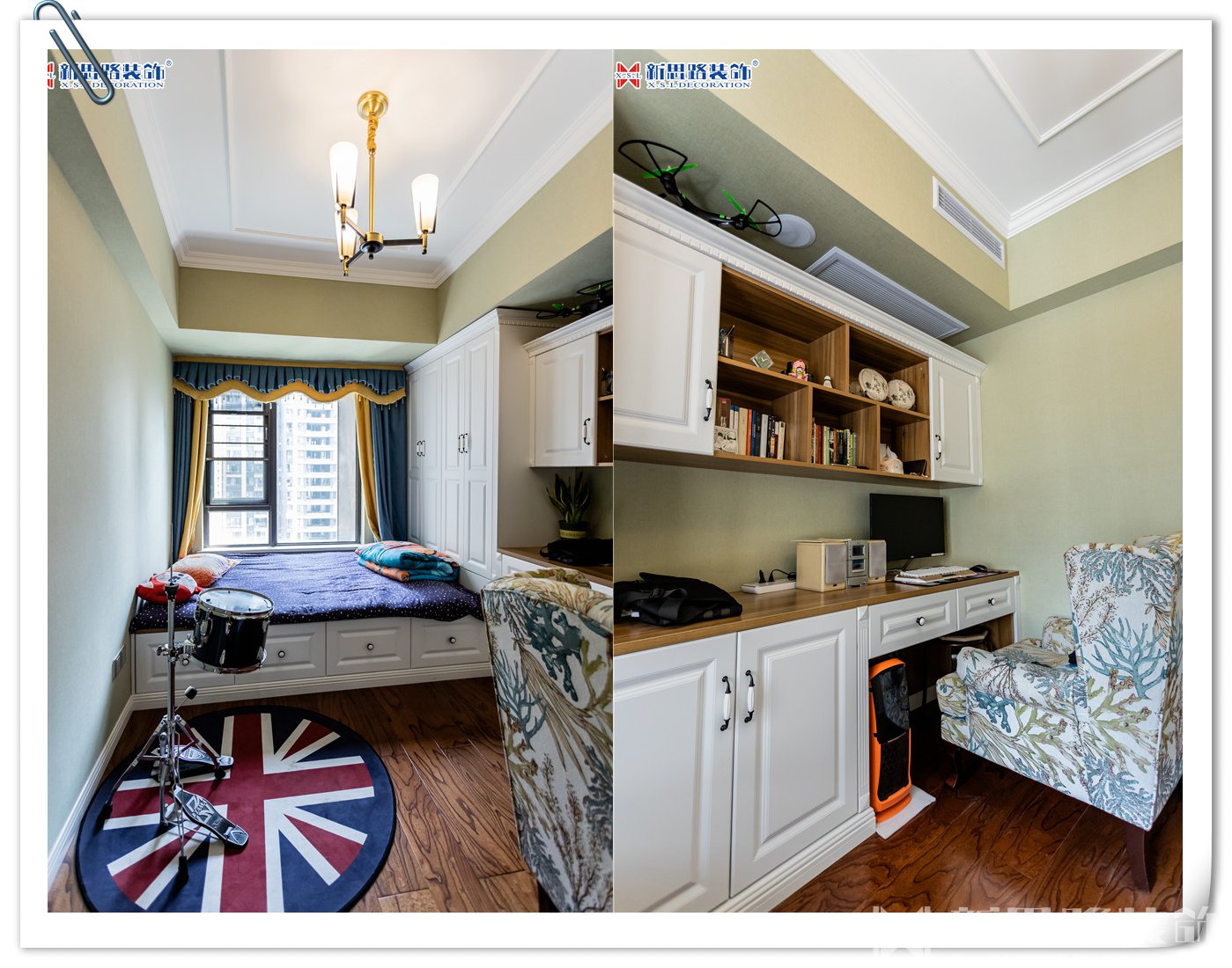 次臥是帥氣兒子的房間。學(xué)生難免書籍和雜物較多,床鋪采用榻榻米的設(shè)計(jì)更便于物品收納,長條形的書桌在擺放電腦后仍留有許多空間。書架近在咫尺,手邊是舊式磁帶播放器,心愛的架子鼓就在身后,音樂夢想和學(xué)習(xí)并不沖突,小小的空間滿載的是青春的律動(dòng)。