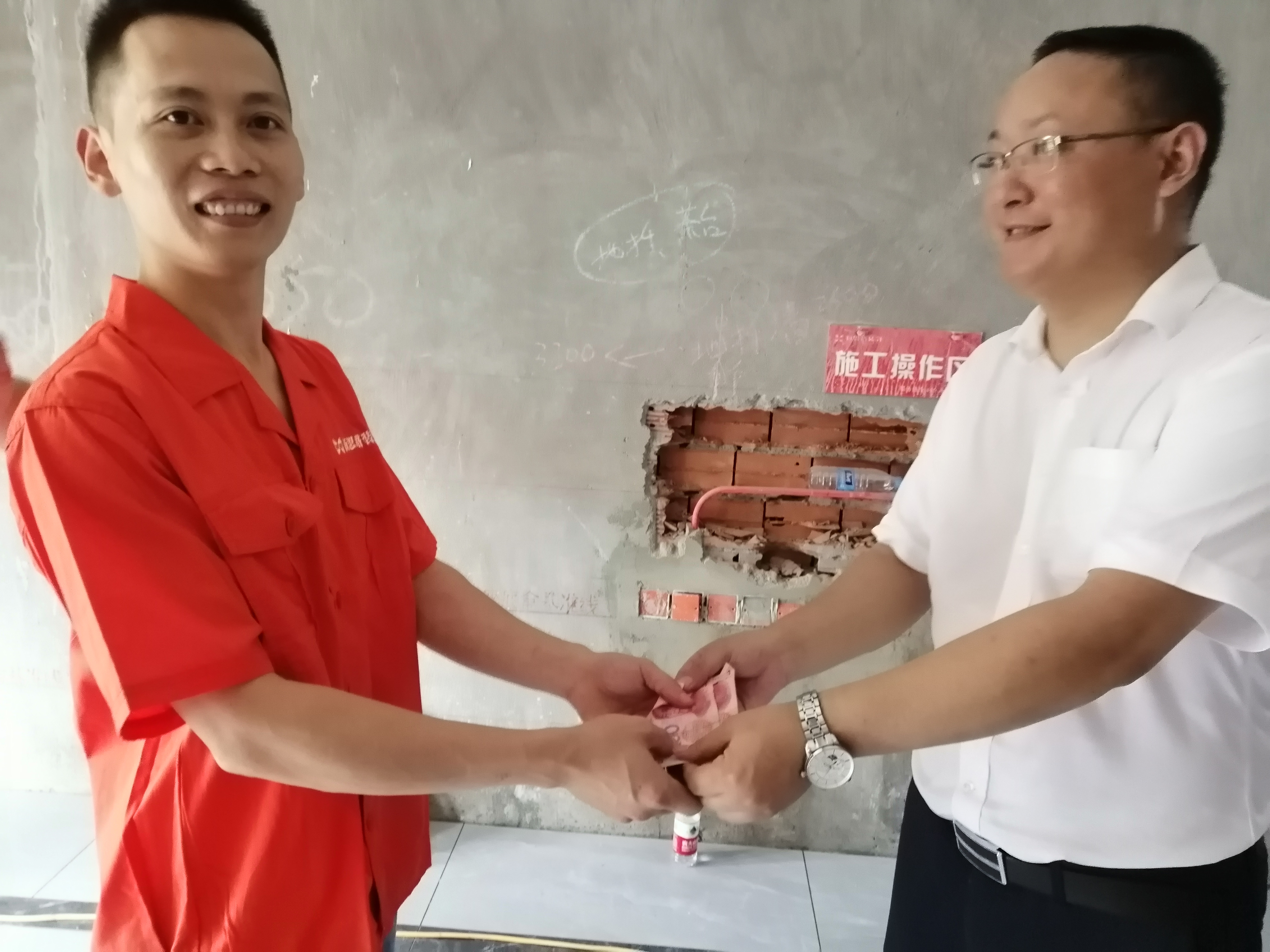 文經(jīng)理給問題回答正確的工人現(xiàn)場發(fā)放現(xiàn)金獎勵