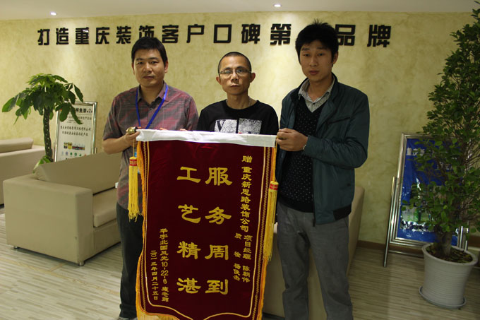 拿著這幅沉甸甸的錦旗,大家臉上都露出了欣慰的笑容,這不僅是對新思路裝飾“放心裝修、品質(zhì)裝修”服務(wù)的高度認可,更是推動我們向更高的目標邁進的強大動力。我們一定會再接再厲,以打造重慶裝飾客戶口碑第一品牌為目標,服務(wù)好每一位業(yè)主,把每一位業(yè)主的家當做自己的家來設(shè)計和裝修,用信譽、質(zhì)量以及貼心的服務(wù)打造更多的精品工程,放心工程,來回報我們的客戶。