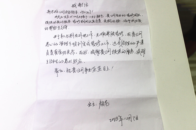 顏老師在信中表示:“由于本人長期在外地工作,無暇兼顧裝修,在貴公司的悉心管理下順利完成裝修工作。貴公司專業(yè)的裝修團(tuán)隊(duì),提供優(yōu)質(zhì)的服務(wù),裝修期間王經(jīng)理認(rèn)真負(fù)責(zé),質(zhì)檢定期巡查工地,保證了工程質(zhì)量。在此,感謝貴公司提供的裝修服務(wù),感謝王經(jīng)理的細(xì)心照應(yīng)。”