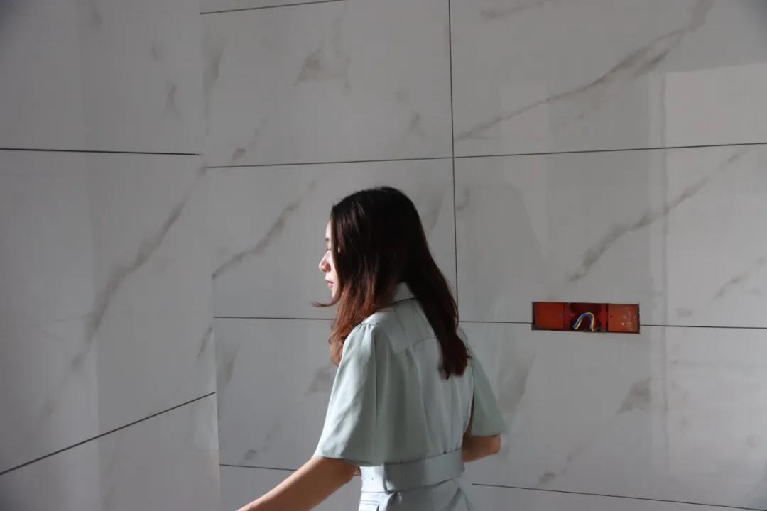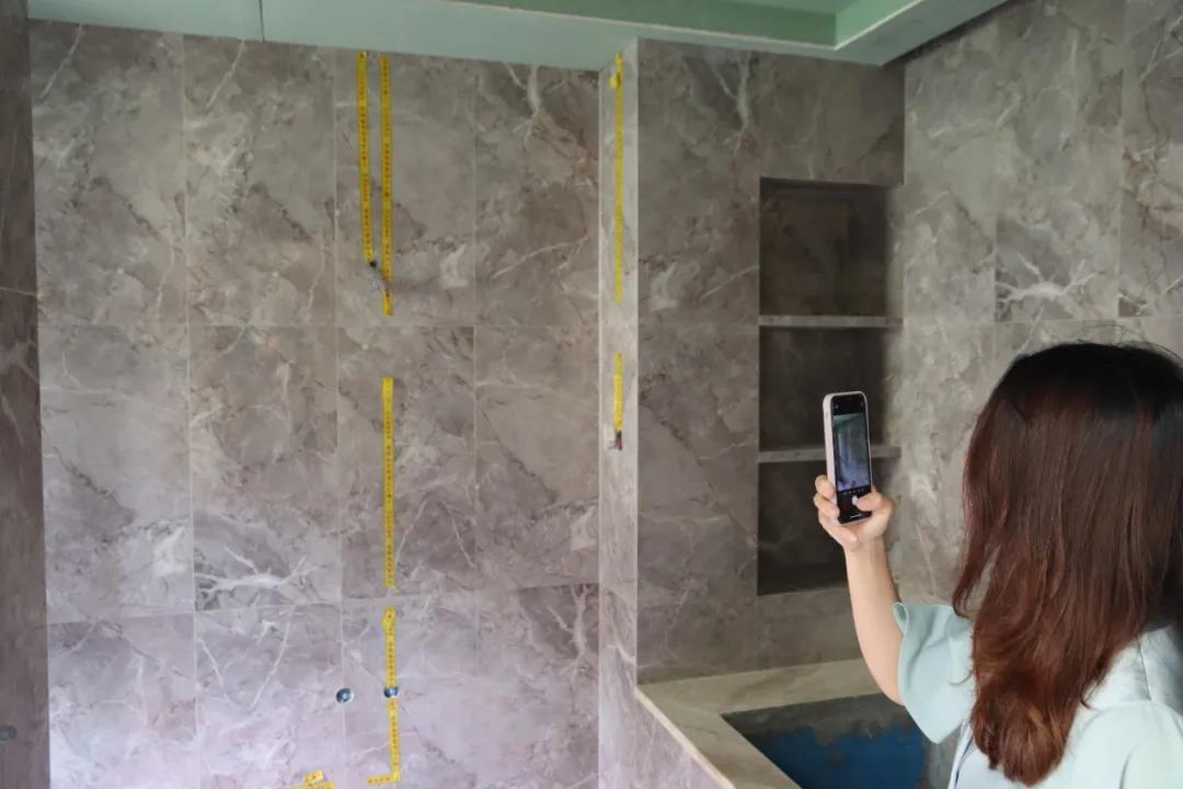 ▲設(shè)計師陳薇正在檢查瓷磚接縫