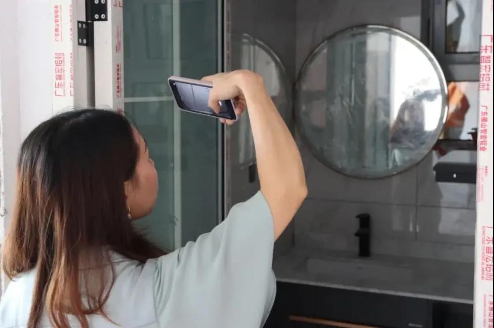 空調(diào)與吊頂、墻面瓷磚接縫和管線標(biāo)識粘貼……設(shè)計師陳薇一項一項檢查過來,并對現(xiàn)場進行拍照存檔、發(fā)送給我們的客戶,讓客戶即使足不出門,也能實時看到供地情況。