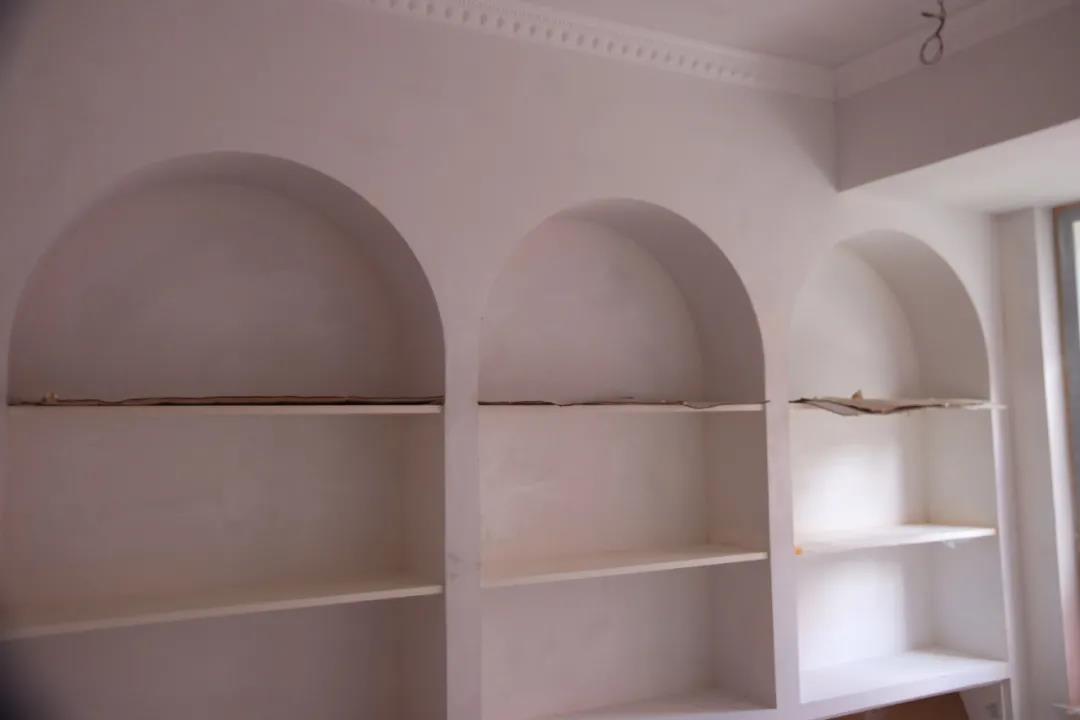 第三個(gè)工地正在硬裝進(jìn)行中。這套案例設(shè)計(jì)上的巧思和花樣比較多,類(lèi)似浮雕的花紋已經(jīng)做好造型,等待燈具的安裝;衛(wèi)生間的墻面也完成了,如同馬賽克的六邊形花紋拼貼低調(diào)中透露出一絲藝術(shù)性,拱門(mén)般的柜架設(shè)計(jì)還帶來(lái)不少別樣風(fēng)情。相信在不久之后,這里會(huì)是客戶(hù)溫暖而美麗的家。