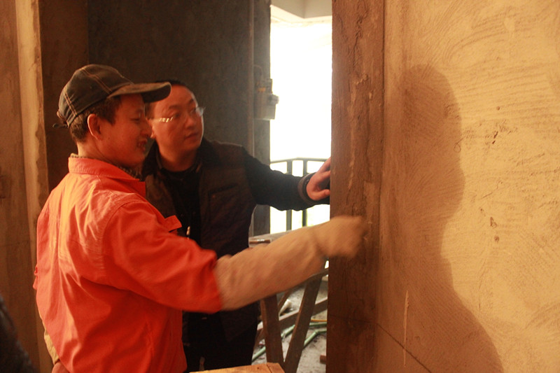 工人師傅正在介紹墻面基層施工細節(jié)