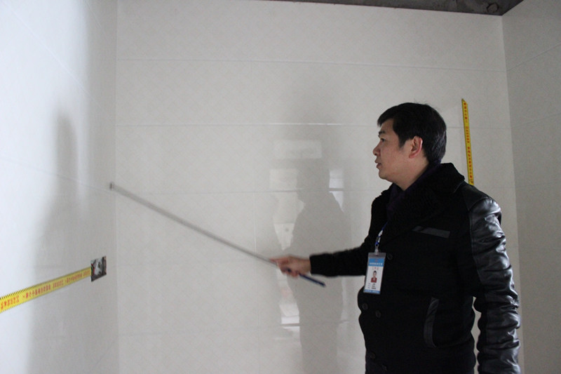 張總正在仔細(xì)查看墻面貼磚工藝