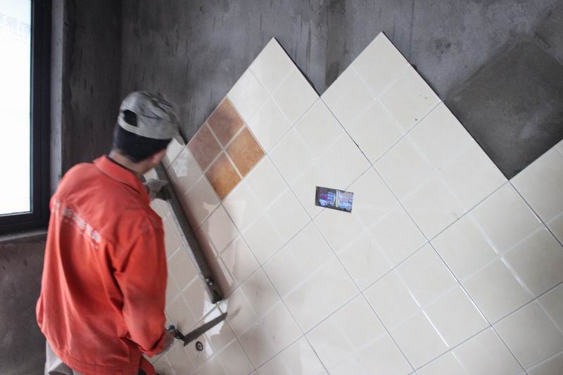 工人師傅正在認(rèn)真鋪貼墻磚